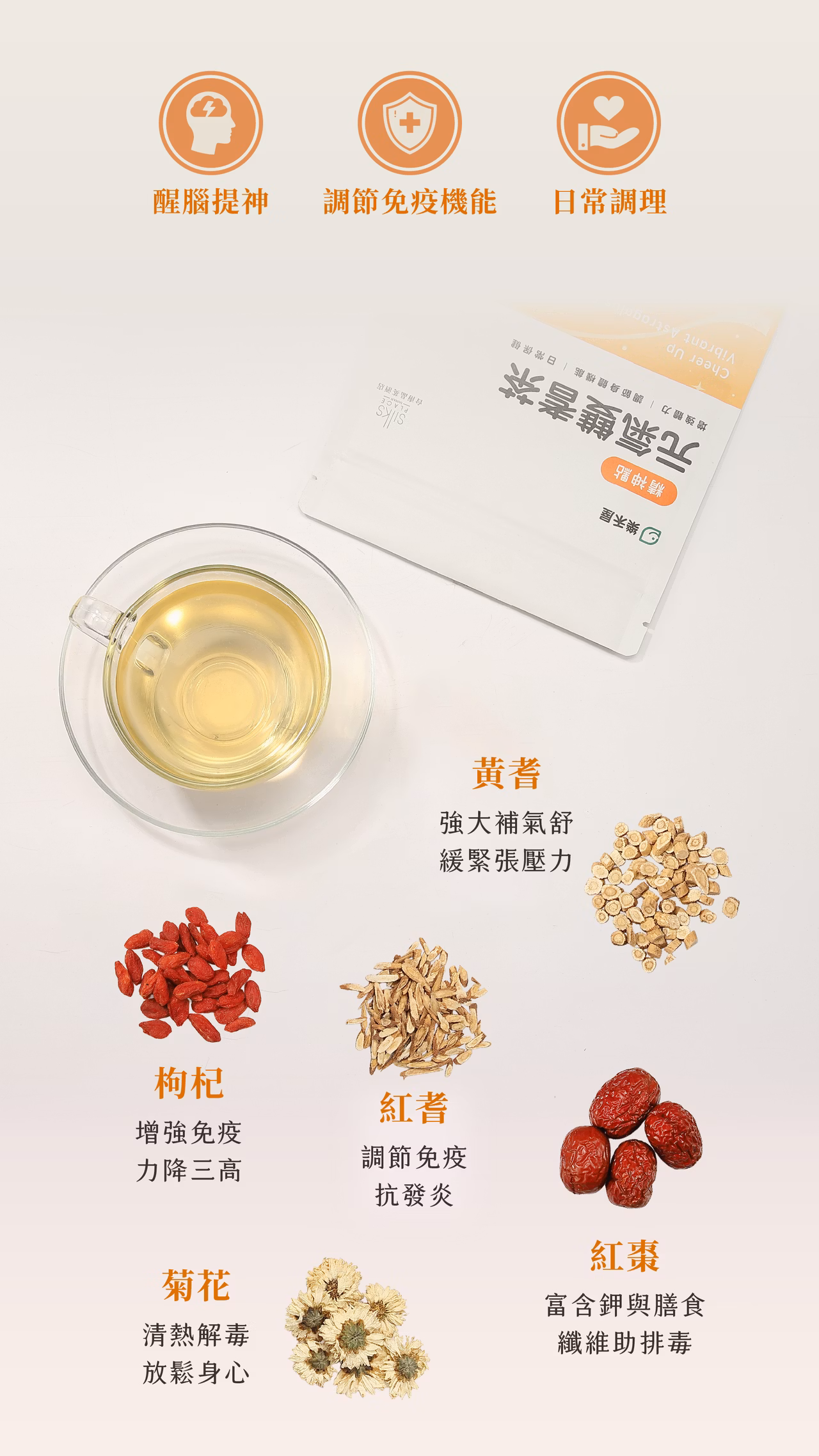 黃耆與紅耆帶出溫和穀物香氣,紅棗與枸杞平衡風味,菊花點出清香層次。
