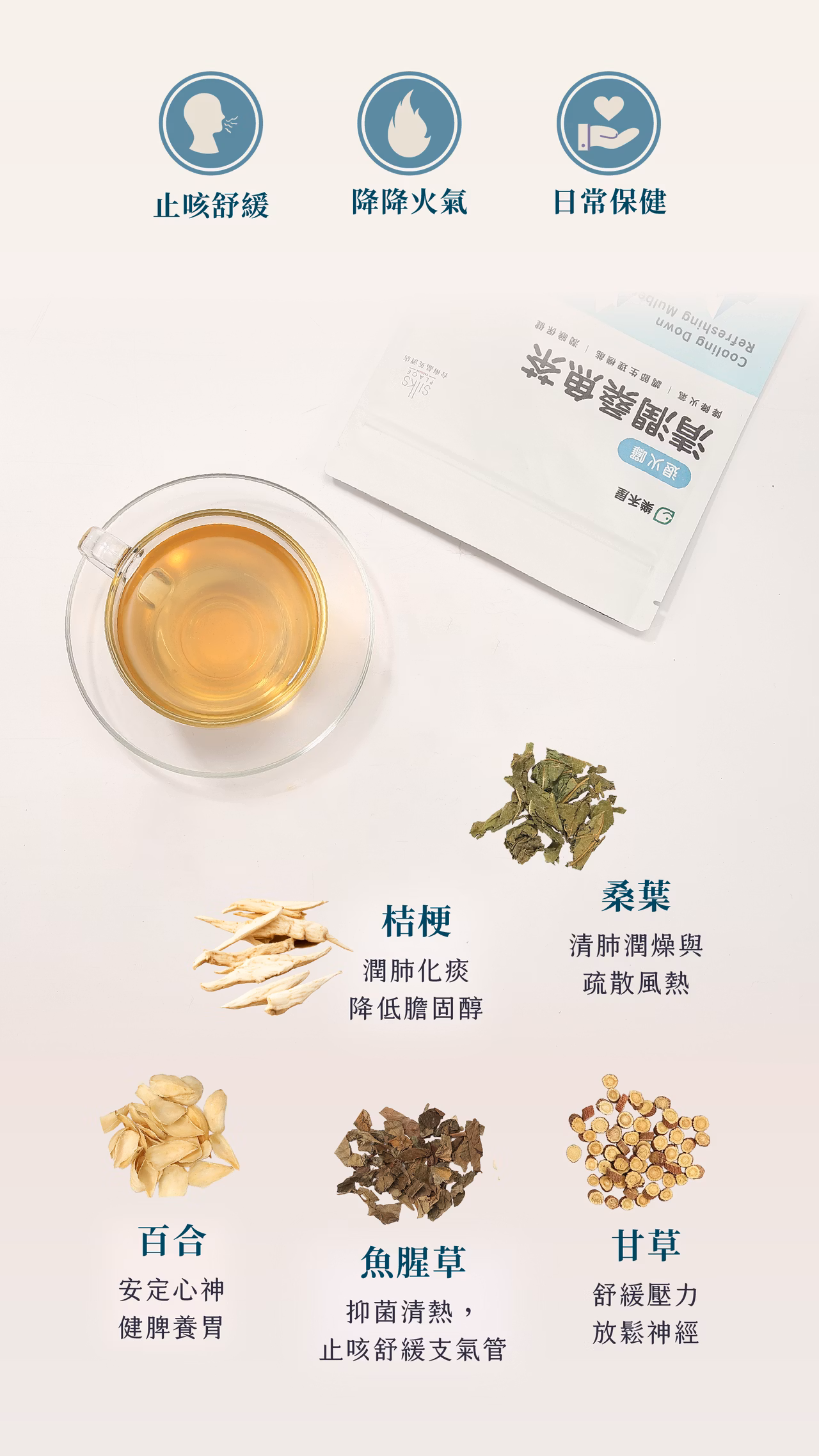 以桑葉為基底,搭配甘草柔化口感,魚腥草風味清淡不顯突兀。桔梗與百合使茶湯喝起來清爽順口,尾韻俐落。適合想要清香口感、作為日常補水或替代含糖飲品的選擇。