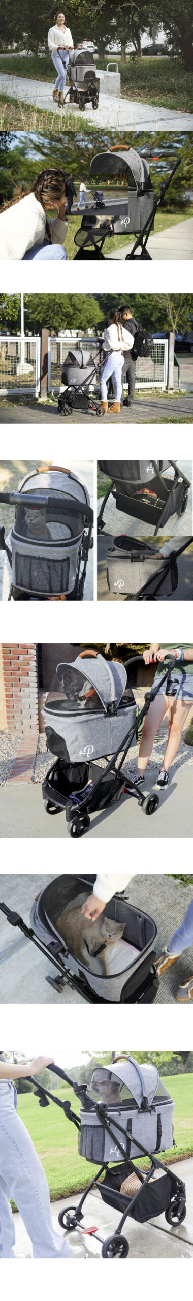 分離式座艙 / 三面高透氣網窗 / 一側有汽車安全帶安裝固定帶 / 後輪減震 / 車頂蓬前後開啟設計 / 前方小拱門出入口 / 兩個置瓶架 / 下方置物籃承重2.3公斤 / 一側有置物口袋 / 兩條安全扣繩 / 經過測試的布料,保護人寵健康